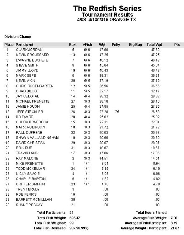 Jordan Still Leads After Day 2 April 9, 2016 Clark Jordan still leads the Elite Redfish Series Tournament after Day 2. Day 3 weigh in will begin at 4pm at the Orange Boat Ramp Sunday.