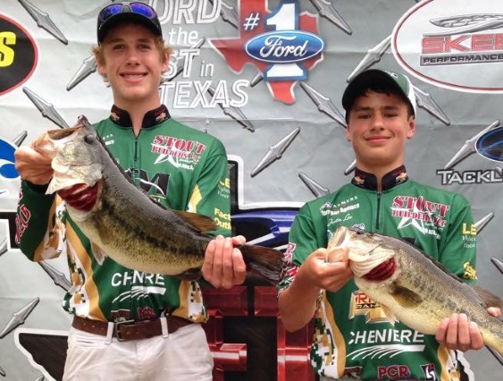 Jack Tindel and Collin Currie show off their bass that helped them take 7th in Sunday’s high school tournament on Sam Rayburn. Orange County teams took 4 of the top ten slots with more than 400 teams competing.